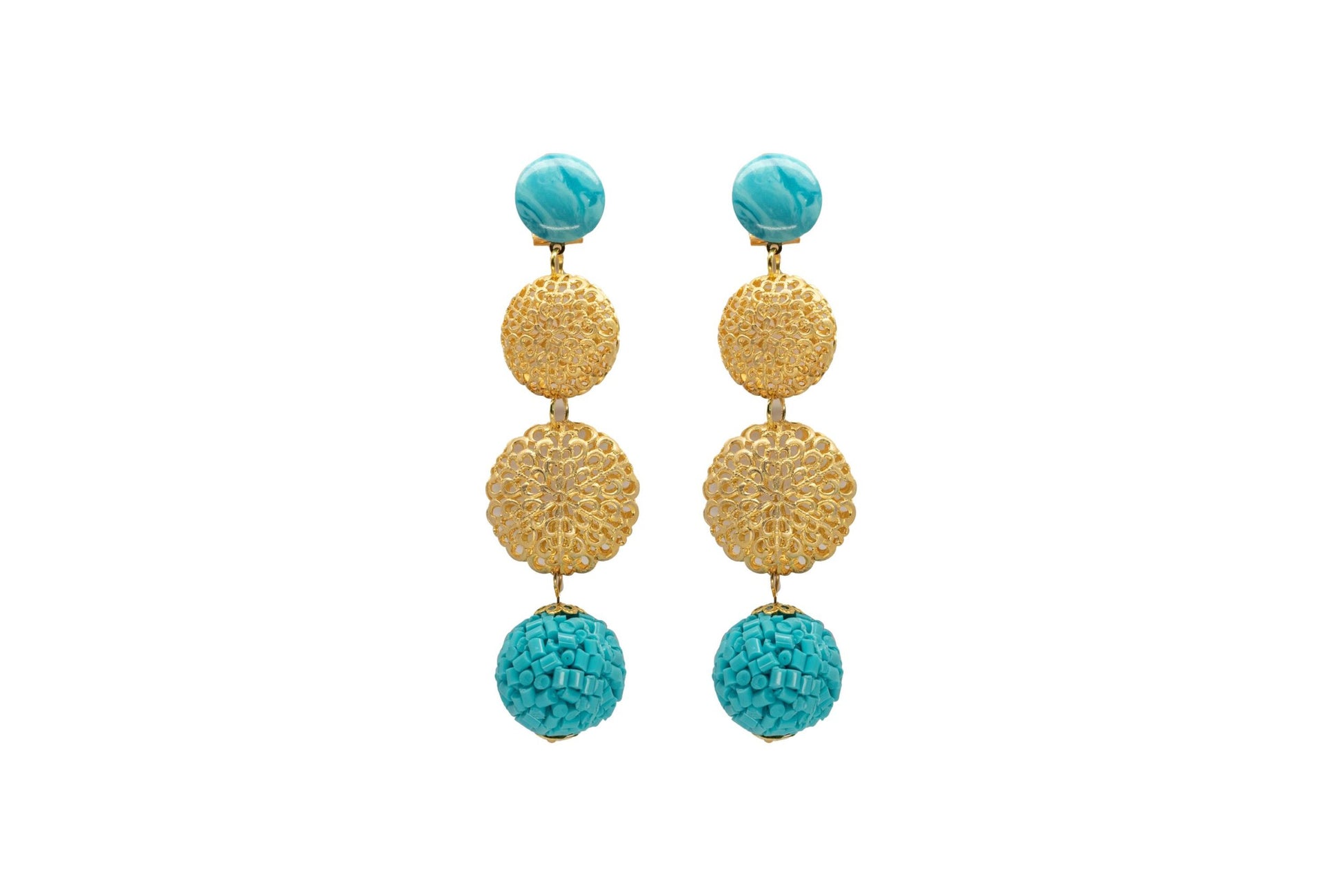 Pendiente dorado de dos círculos labrados, esfera final turquesa y aplique estilo acuarela