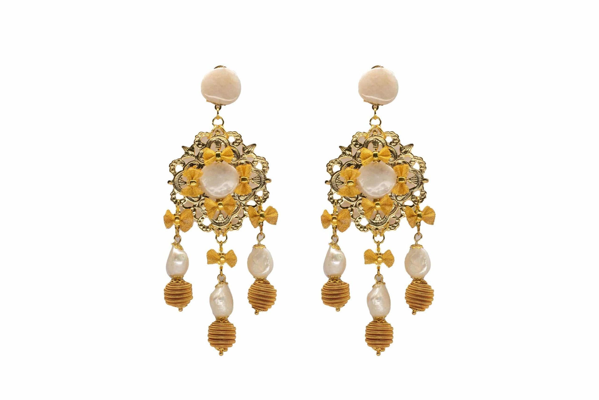 Pendientes de aros pequeños con aplique de flores blancas y colgante de perlitas redondas