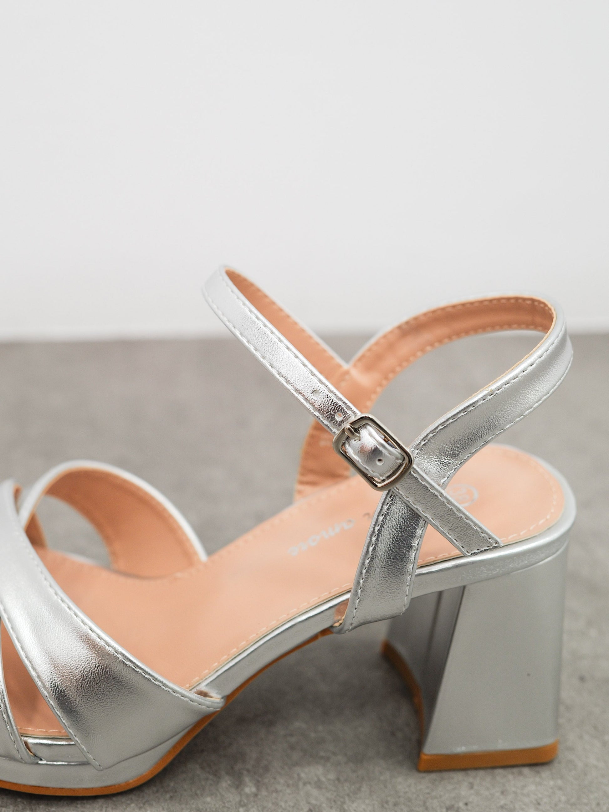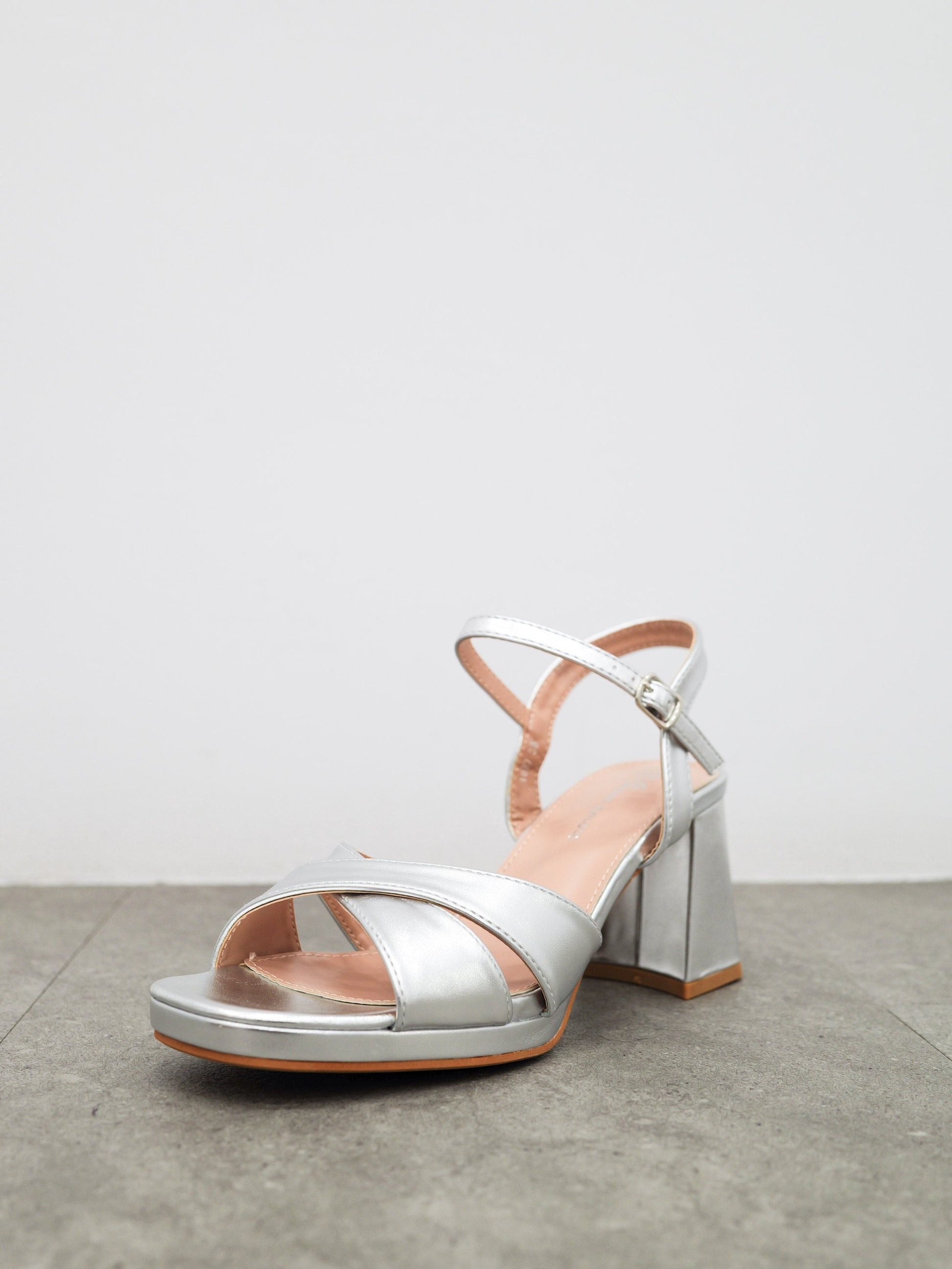 Zapato de tacón bajo atado al tobillo con detalle de bandas cruzadas.