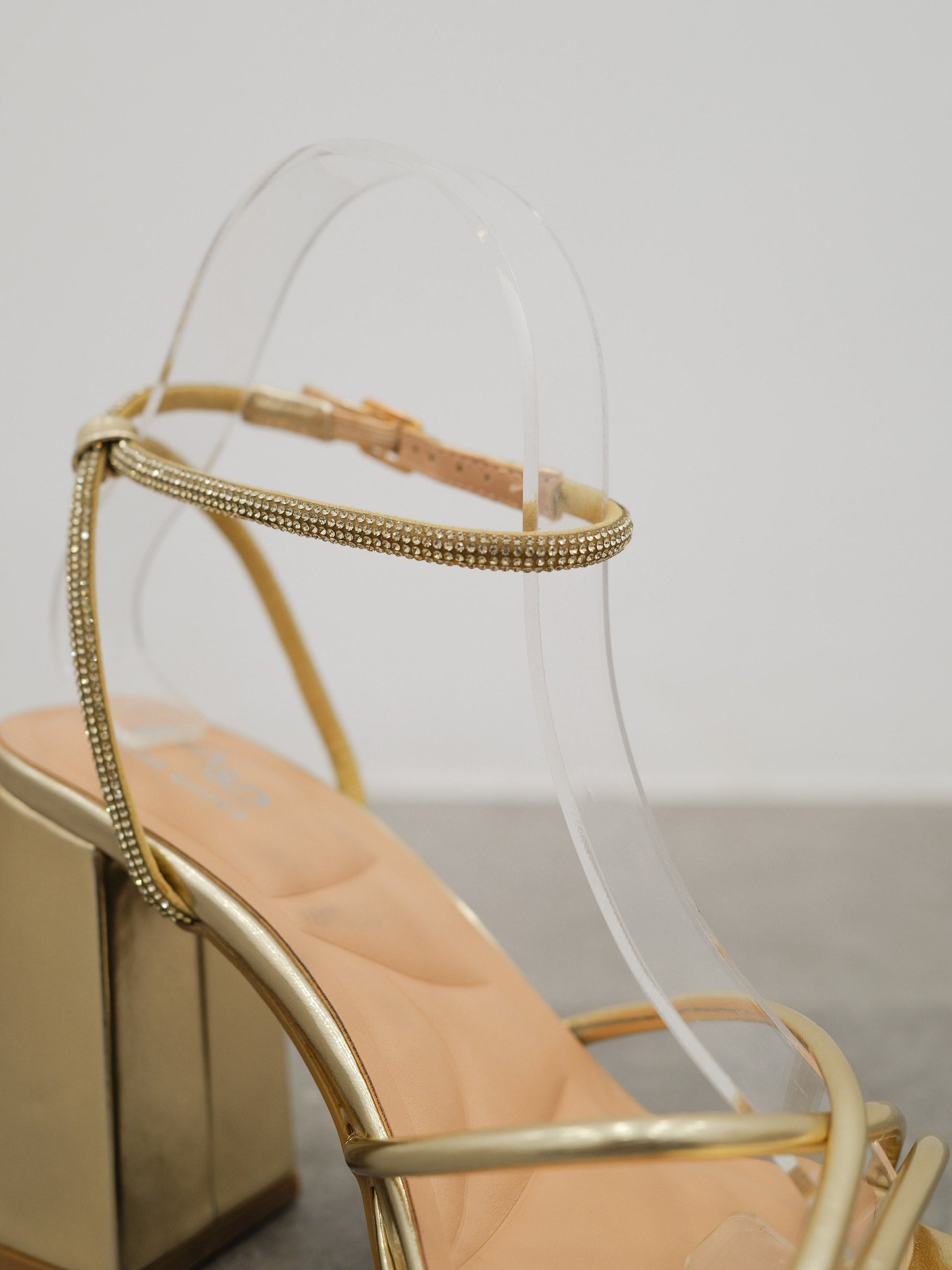 Zapato de tacón con tiras cruzadas que sujetan el pie y detalle de brillantes en el tobillo. Atado al tobillo.