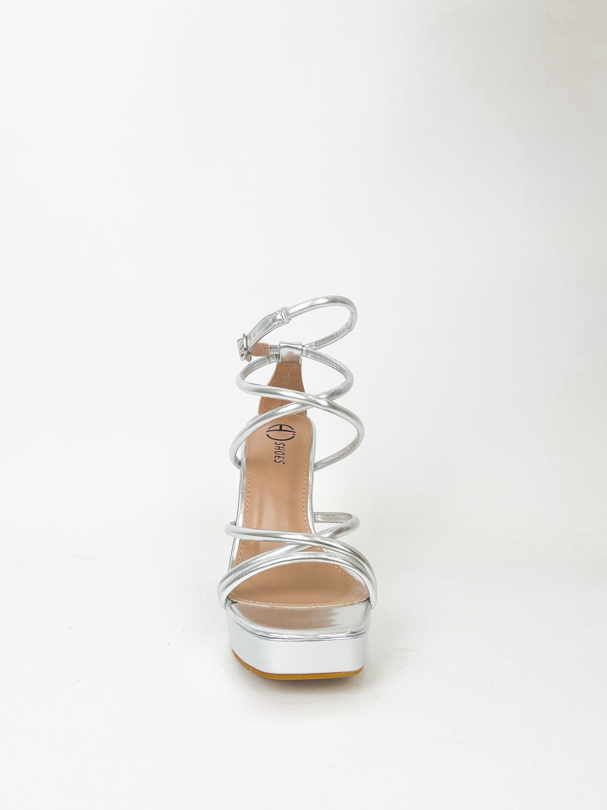 Zapato de tacón alto de color plata con tiras entrelazadas atado al tobillo con hebilla plateada.