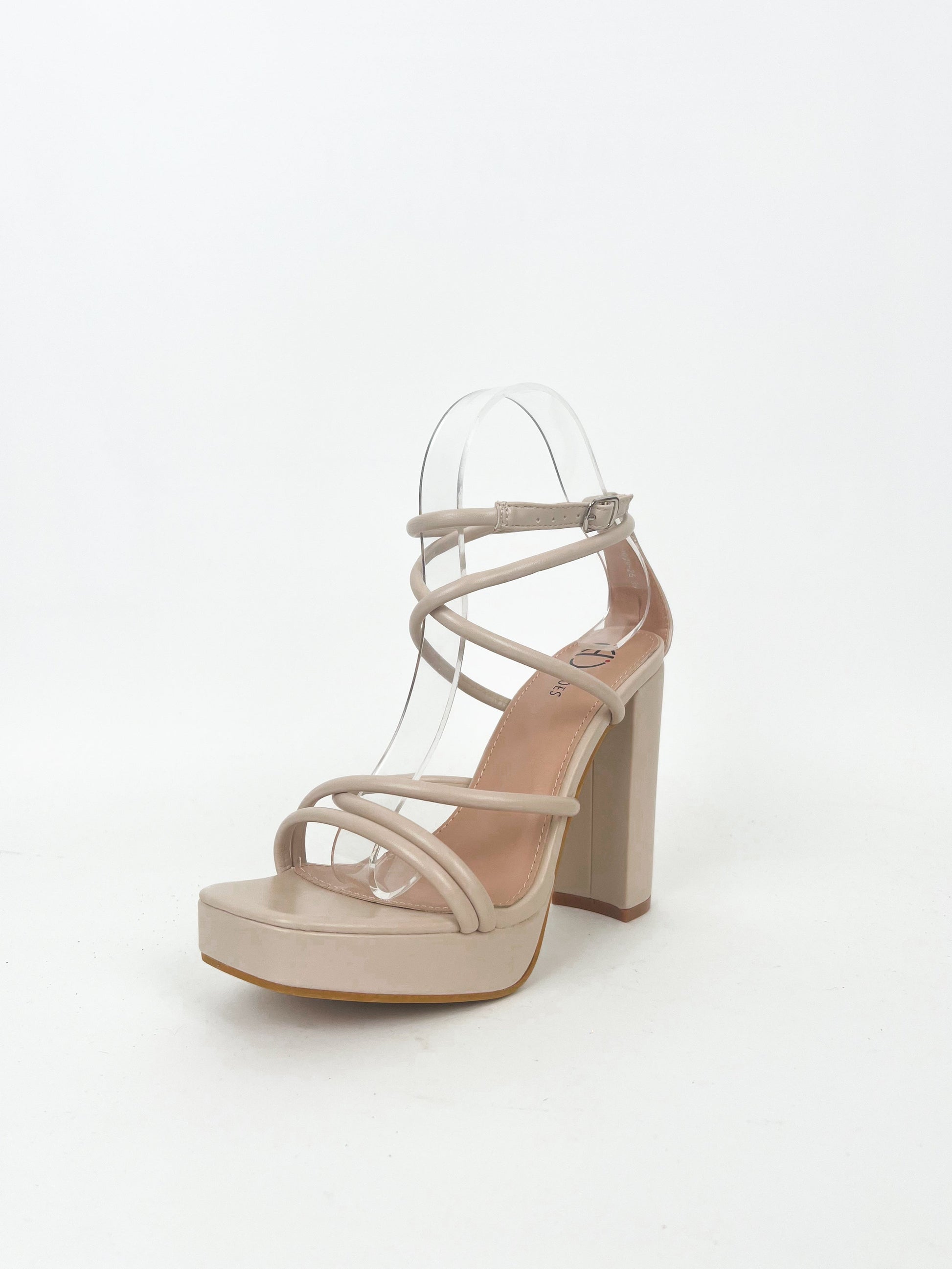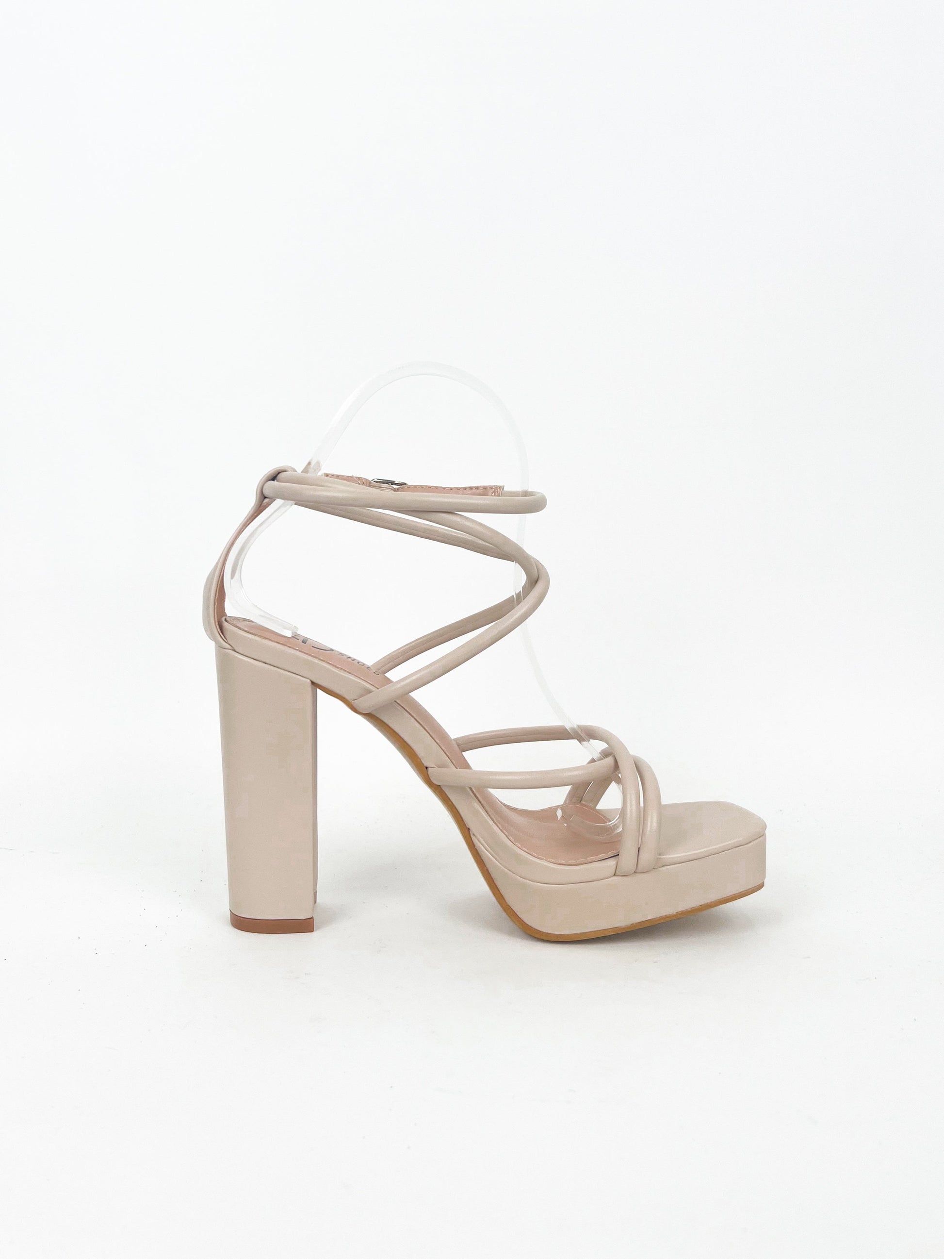 Zapato de tacón alto de color nude con tiras entrelazadas atado al tobillo con hebilla dorada.